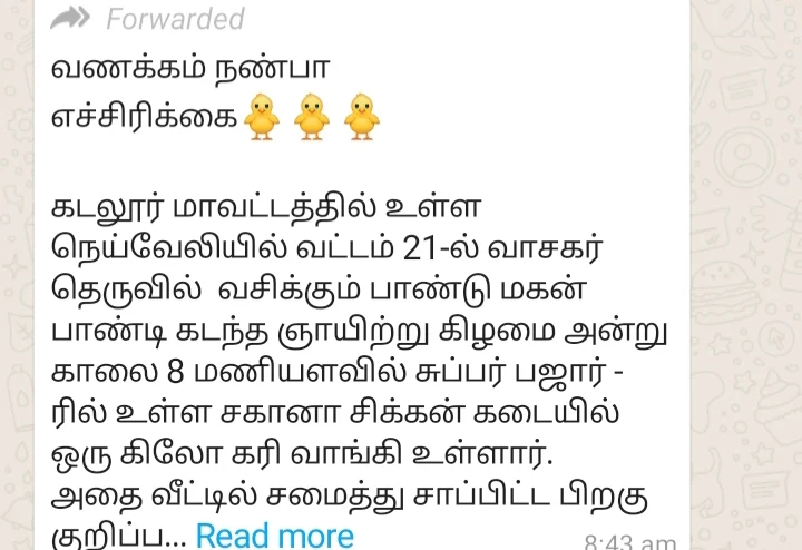 சீனாவில் உருவான கொரோனா வைரஸ் உலக நாடுகளை அச்சுறுத்தி வரும் நிலையில், கறிக்கோழி வழியாக கொரோனா வைரஸ் பரவும் என்று கூறப்படும் வதந்திகள் உருவாகின. அந்த வகையில் தமிழகத்தில் நெய்வேலியில் கொரோனா வைரசால் கோழி பாதிக்கப்பட்டது கண்டறியப்பட்டுள்ளது. இந்த செய்தியை தயவு செய்து அனைவருக்கும் பகிரவும் மற்றும் கோழியை உண்பதை தவிர்க்கவும்.