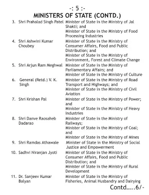 பிரகலாத் ஜோஷி நாடாளுமன்ற விவகாரங்கள்; நிலக்கரி; சுரங்கங்கள்நாராயண் ராணே குறு, சிறு, நடுத்தர தொழில்கள்